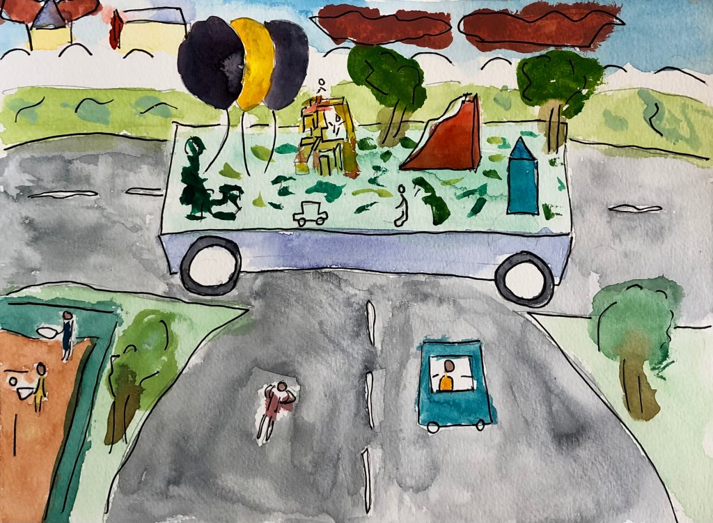 On ne s’interrogeait pas sur la nature du Petit Square, sur ce qui lui permettait de rouler. Son socle était fait de terre et de pierres et il tenait sur des grandes roues d’un bleu électrique encore plus brillant que celui du goudron des routes des Calidon. Il n’y avait pas de carburant dans son réservoir, les roues parfois rentraient dans la terre, quand cela semblait plus simple pour y circuler et elles y creusaient un sillon ; c’est comme ça que parfois le Petit Square quittait la ville pour aller faire une tournée dans les villages alentours.